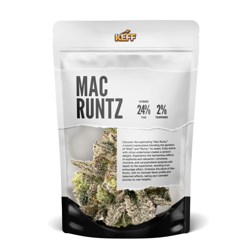 Discover the captivating “Mac Runtz,” a hybrid masterpiece blending the genetics of “MAC” and “Runtz.” Its sweet, fruity aroma with citrus undertones creates a sensory delight. Experience the harmonious effects of euphoria and relaxation. Limonene, myrcene, and caryophyllene terpenes add depth to the experience, resulting in an entourage effect. Embrace the allure of Mac Runtz, with its intricate flavor profile and balanced effects, taking your cannabis journey to new heights.